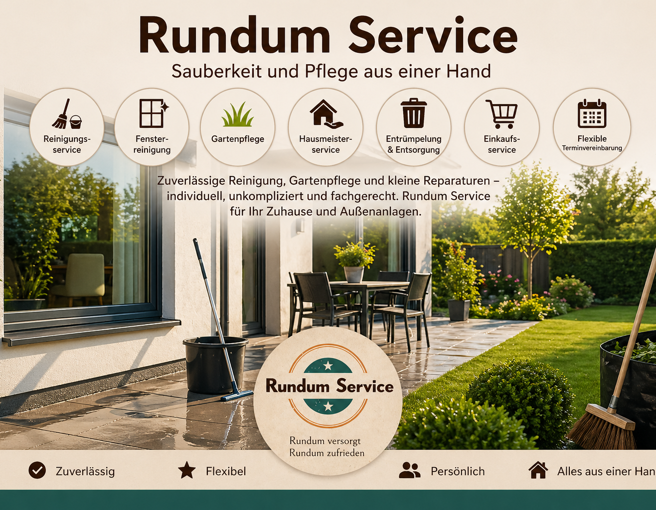 Zuverlässige Reinigung, Gartenpflege und kleine Reparaturen – individuell, unkompliziert und fachgerecht. Rundum Service für Ihr Zuhause und Außenanlagen.