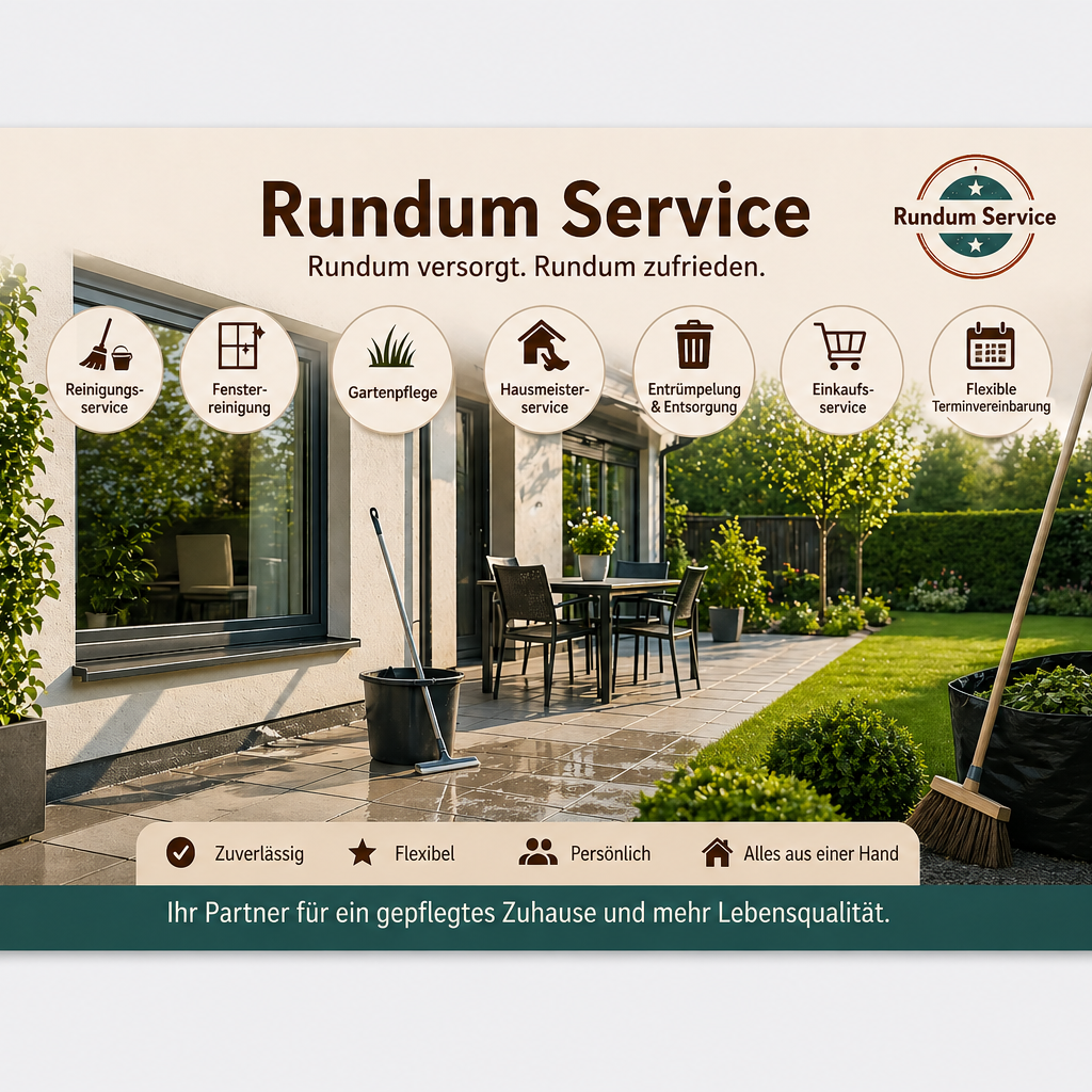 Zuverlässige Reinigung, Gartenpflege und kleine Reparaturen – individuell, unkompliziert und fachgerecht. Rundum Service für Ihr Zuhause und Außenanlagen.